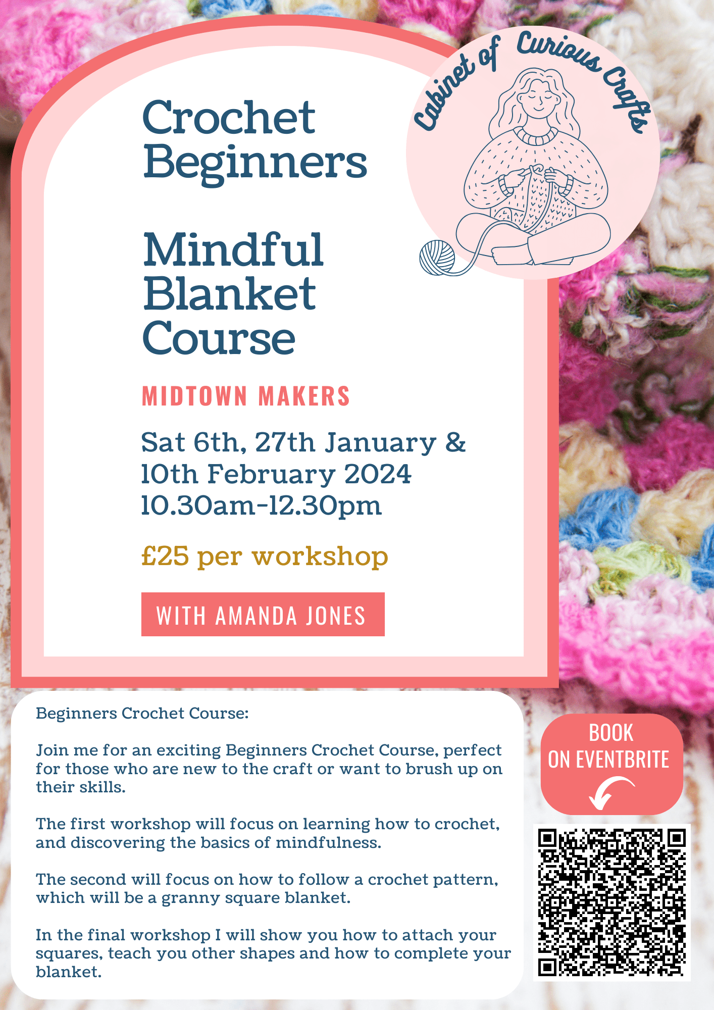 Happy New Year! I wanted to let you know about my workshops for 2024. I have beginners crochet, next steps and part 3 of the Mindful Blanket Beginners Course that started in January.