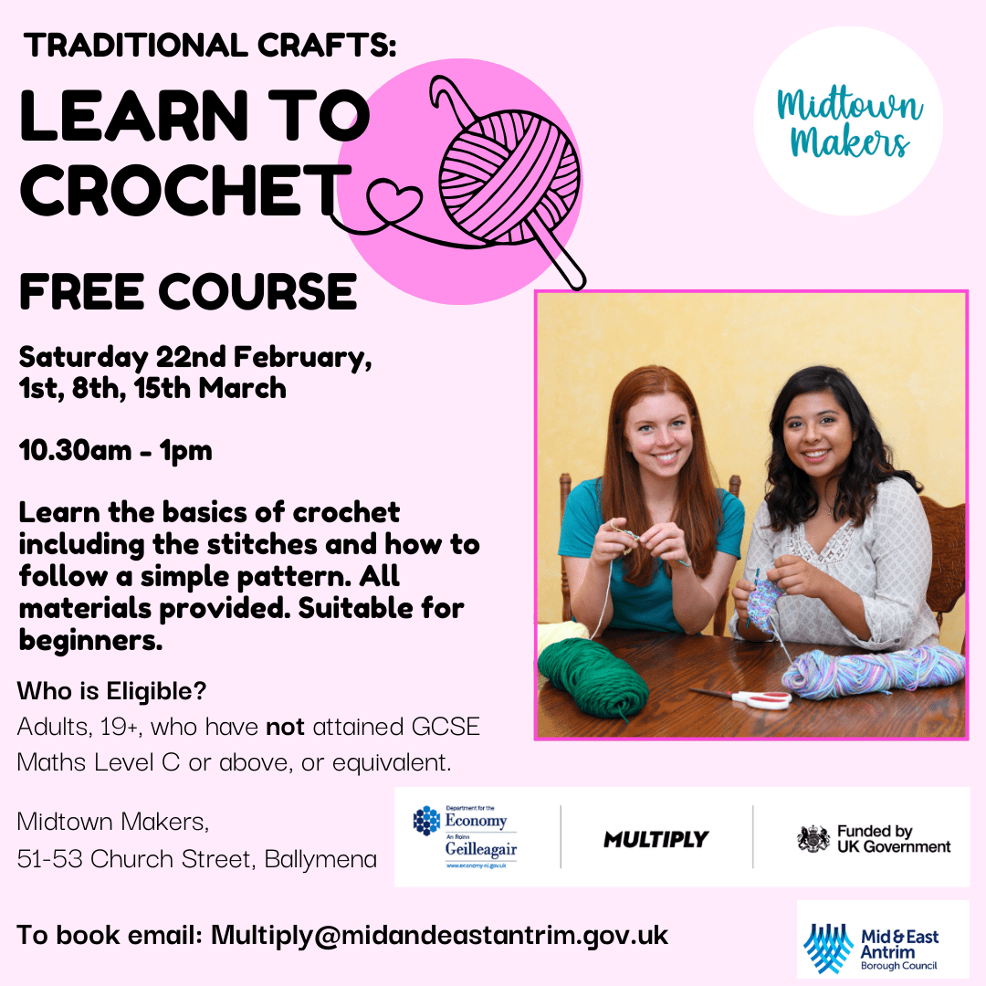 New Year, New Hobby I have 2 new learn to crochet courses at Midtown Makers in 2025! A FREE 4 week course with Mid and East Antrim Borough Council Multiply for those who don’t have level 2 maths / GCSE C maths or equivalent. All materials and refreshments provided. Starts on Saturday 22nd Feb 2025.Continue reading “New Year, New Hobby”