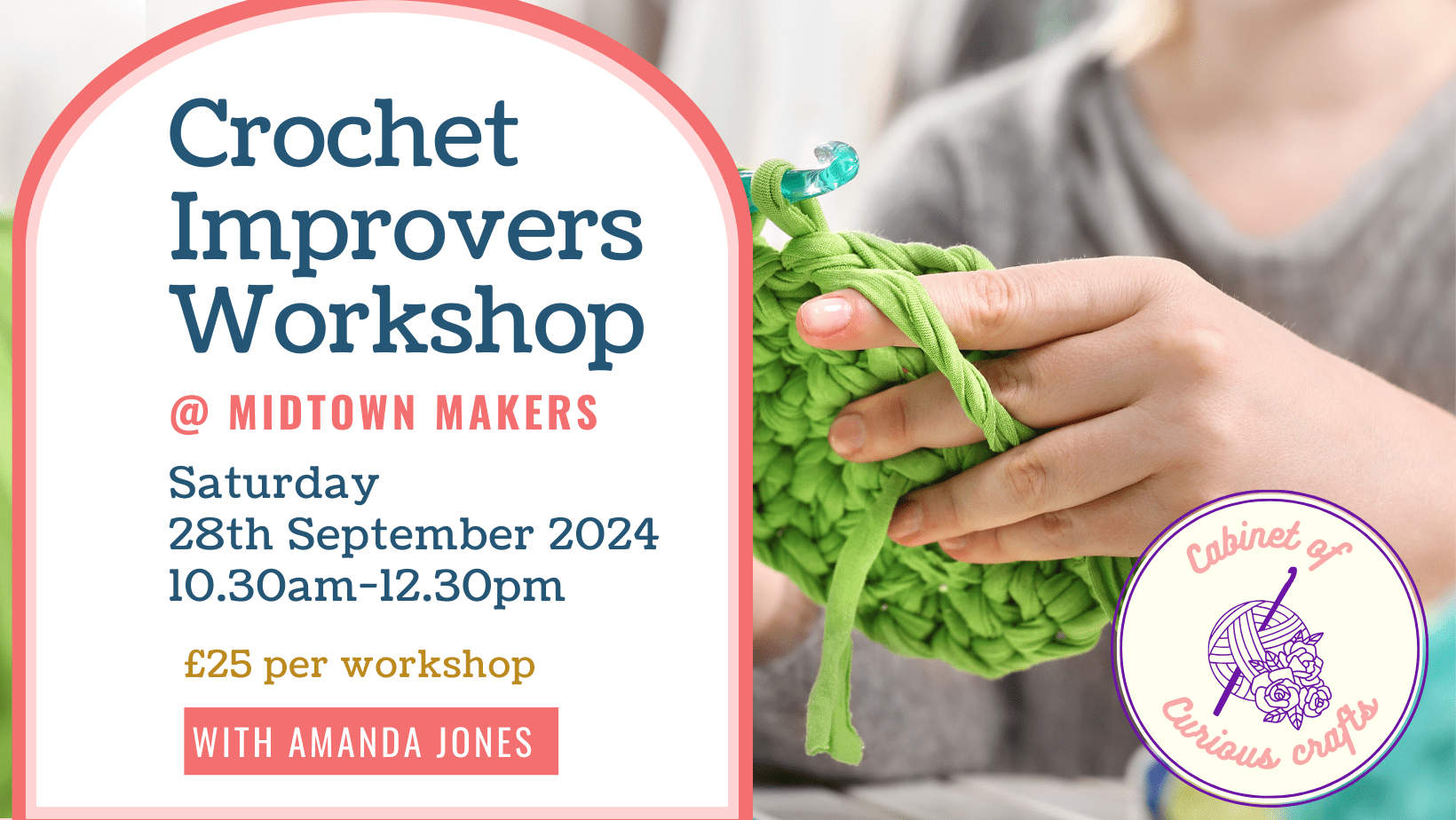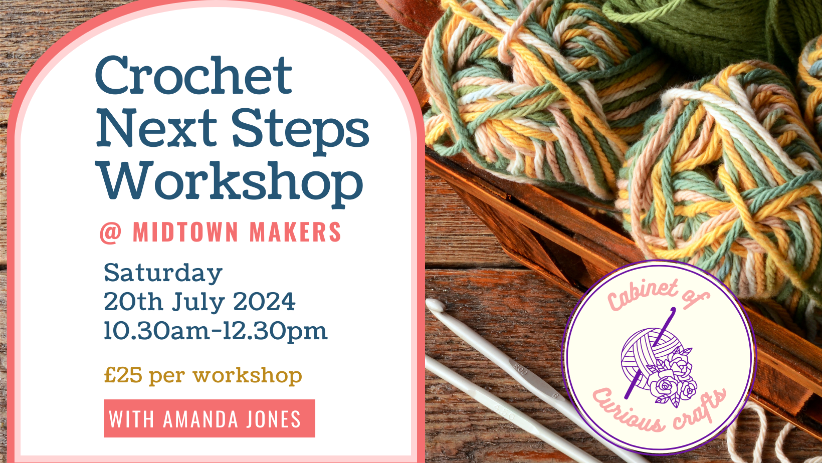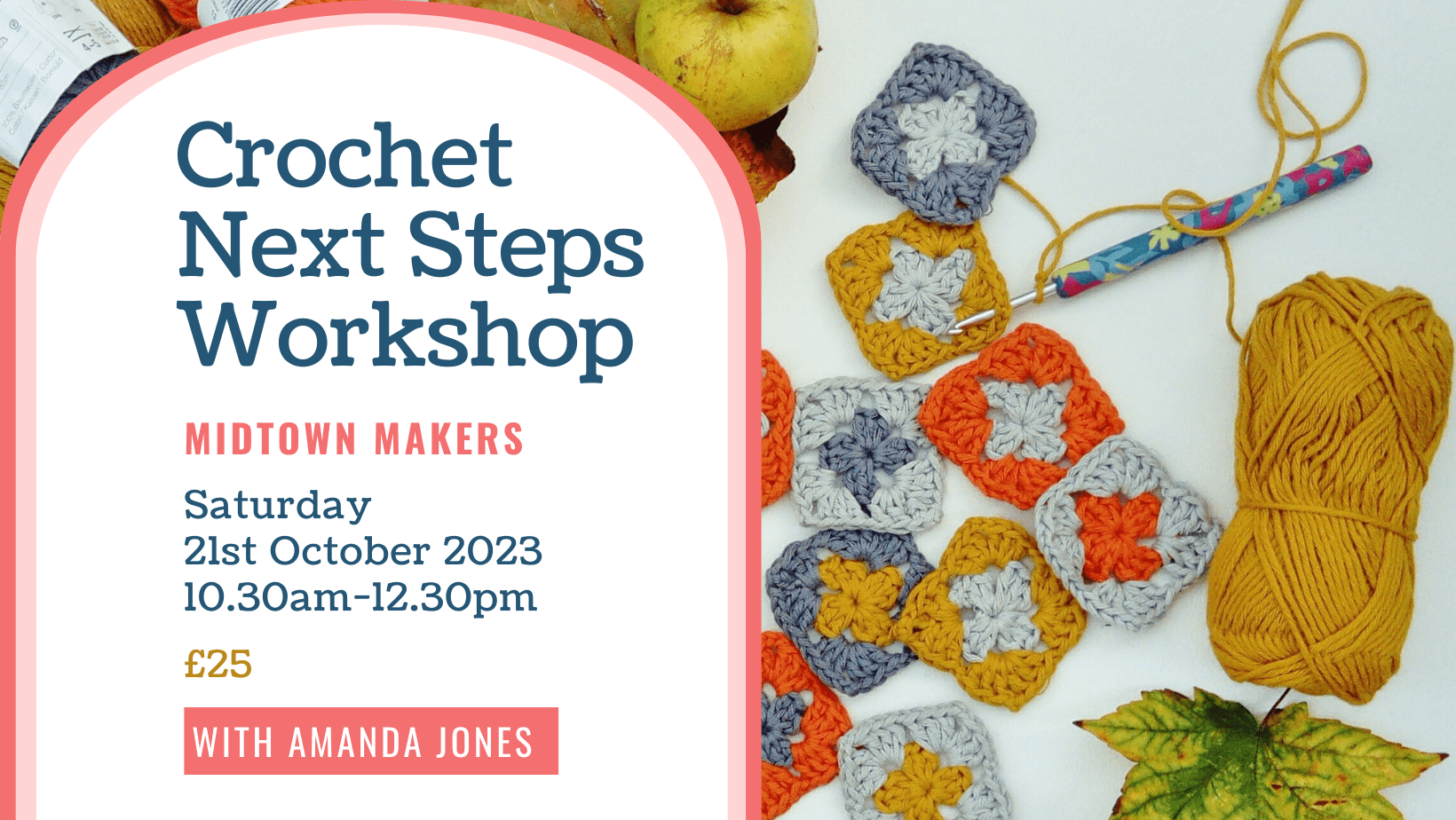 Join me for an exciting Beginners Crochet class, perfect for those who are new to the craft or want to brush up on their skills. Get ready to unleash your creativity and learn the art of crochet! Date: Fri 22nd Sept 2023 Time: 10:30 AM Location: MIDTOWN MAKERS