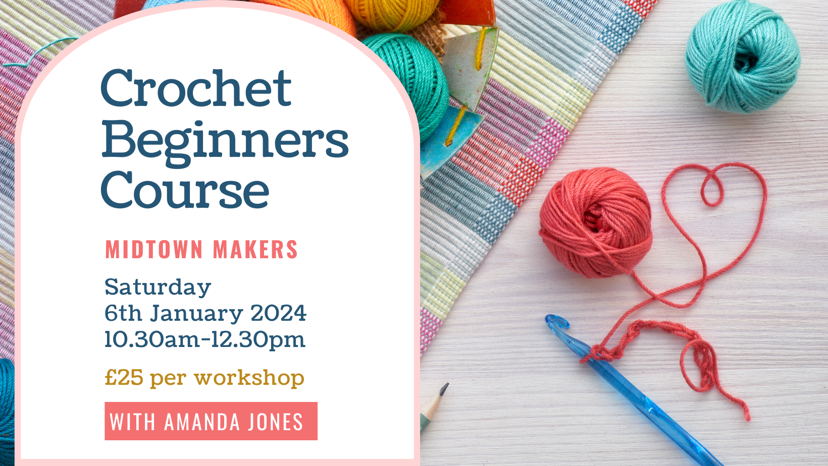 During this Week day beginners workshop, I will guide you through the basics of crochet. I will teach you techniques, and tips to create beautiful projects. Date: Tuesday 23rd January 2024 Time: 1:30 pm Location: MIDTOWN MAKERS