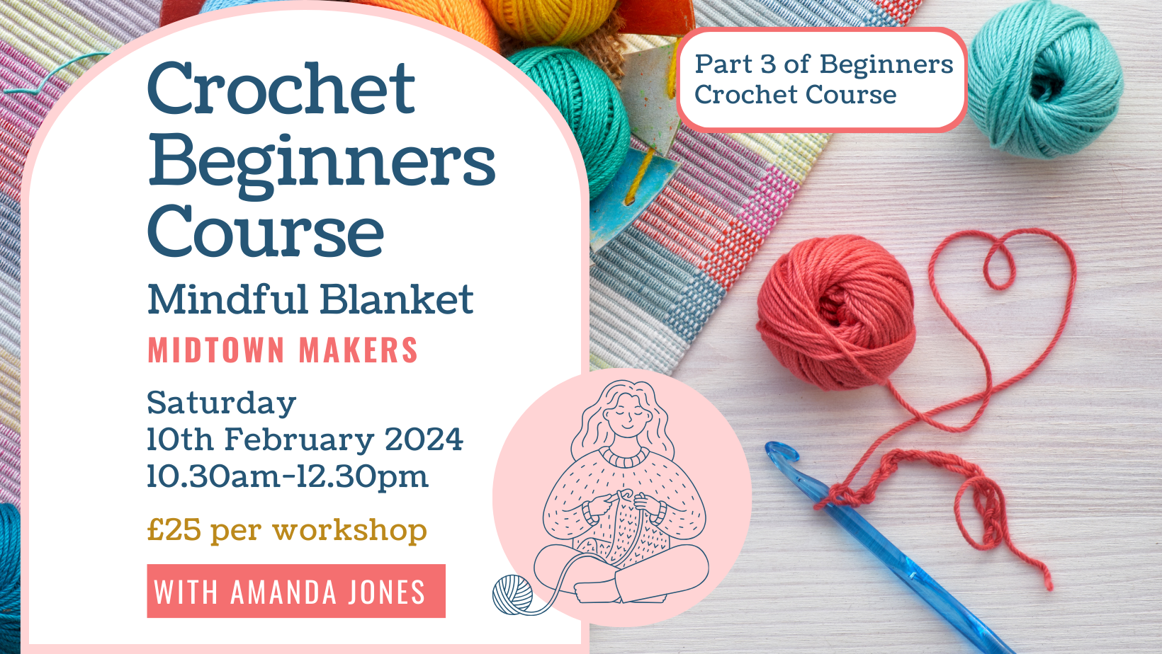 Part 3 – The final 2 hour class in the Beginners Course, on Saturday 10th Feb, will focus on refining crochet skills and introducing new techniques in both crochet and mindfulness, whilst continuing with the blanket project. Date: Saturday 10th February 2024 Time: 10:30 am Location: MIDTOWN MAKERS