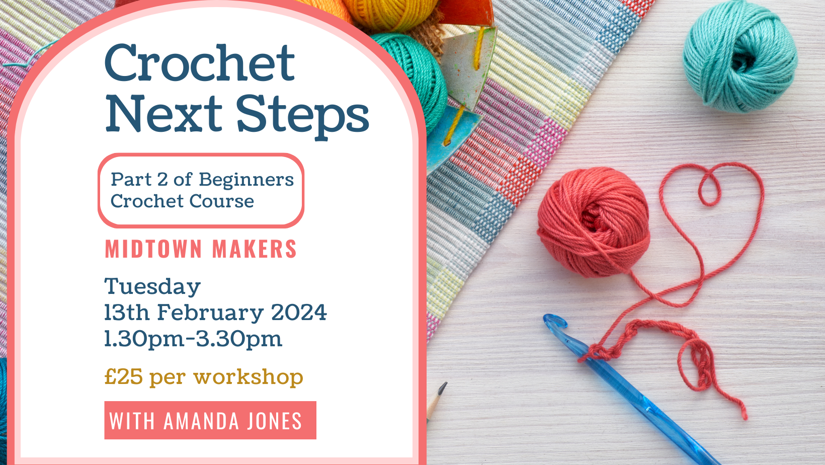 Join me for an exciting Crochet Next Steps (Beginners Course part 2) class, perfect for those who have basic skills or want to brush up on their skills. I will teach you how to follow a pattern and start a project you can complete at home. Date: Tuesday 13th Feb 2024 Time: 1:30pm- 3.30pm Location: Midtown Makers, Ballymena, NI