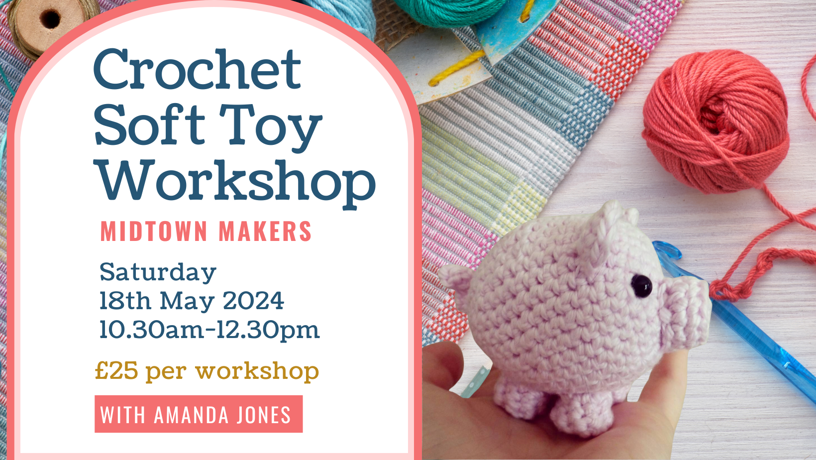 Crochet Soft Toy (Amigurumi) Workshop. Learn the Japanese crochet method of amigurumi, to make soft toys. I will guide you to create your own soft toy pig. To take part in this workshop you’ll already know the basics of crochet. Date: Saturday 18th May 2024 Time: 10:30am – 12.30pm Location: MIDTOWN MAKERS, Ballymena, NI