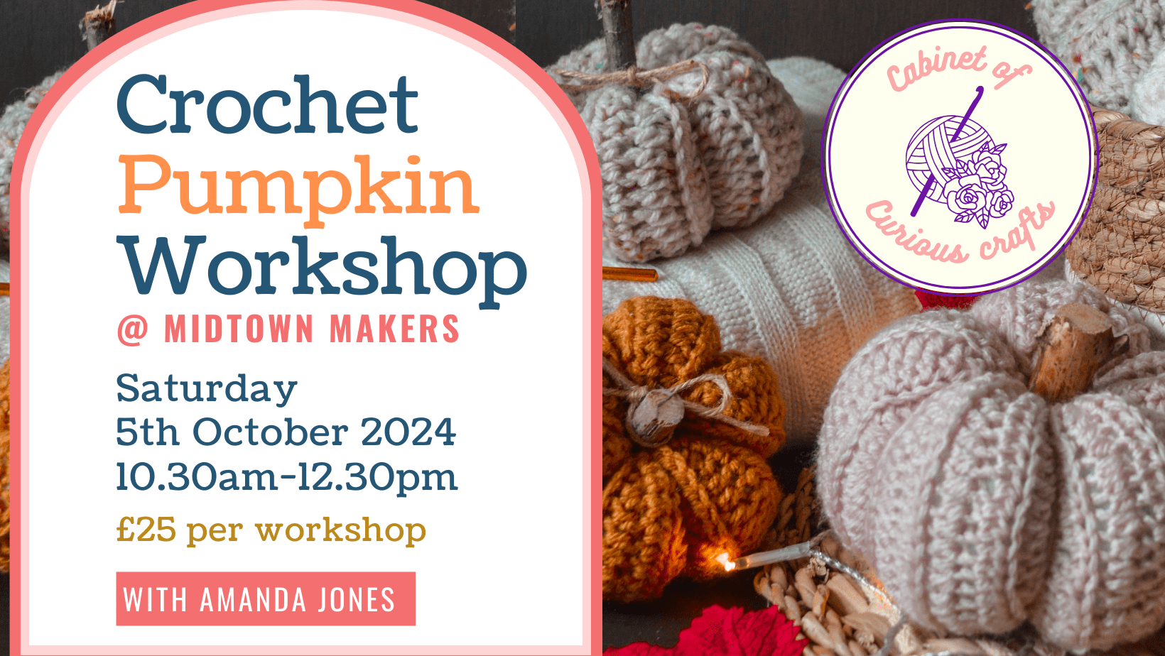 Crochet Halloween pumpkin workshop: Halloween crochet workshop? Yes please! Join me at Midtown Makers for a morning of pumpkin making with a difference. I will teach you how to crochet your own pumpkin decoration and stitch on a spooky face.